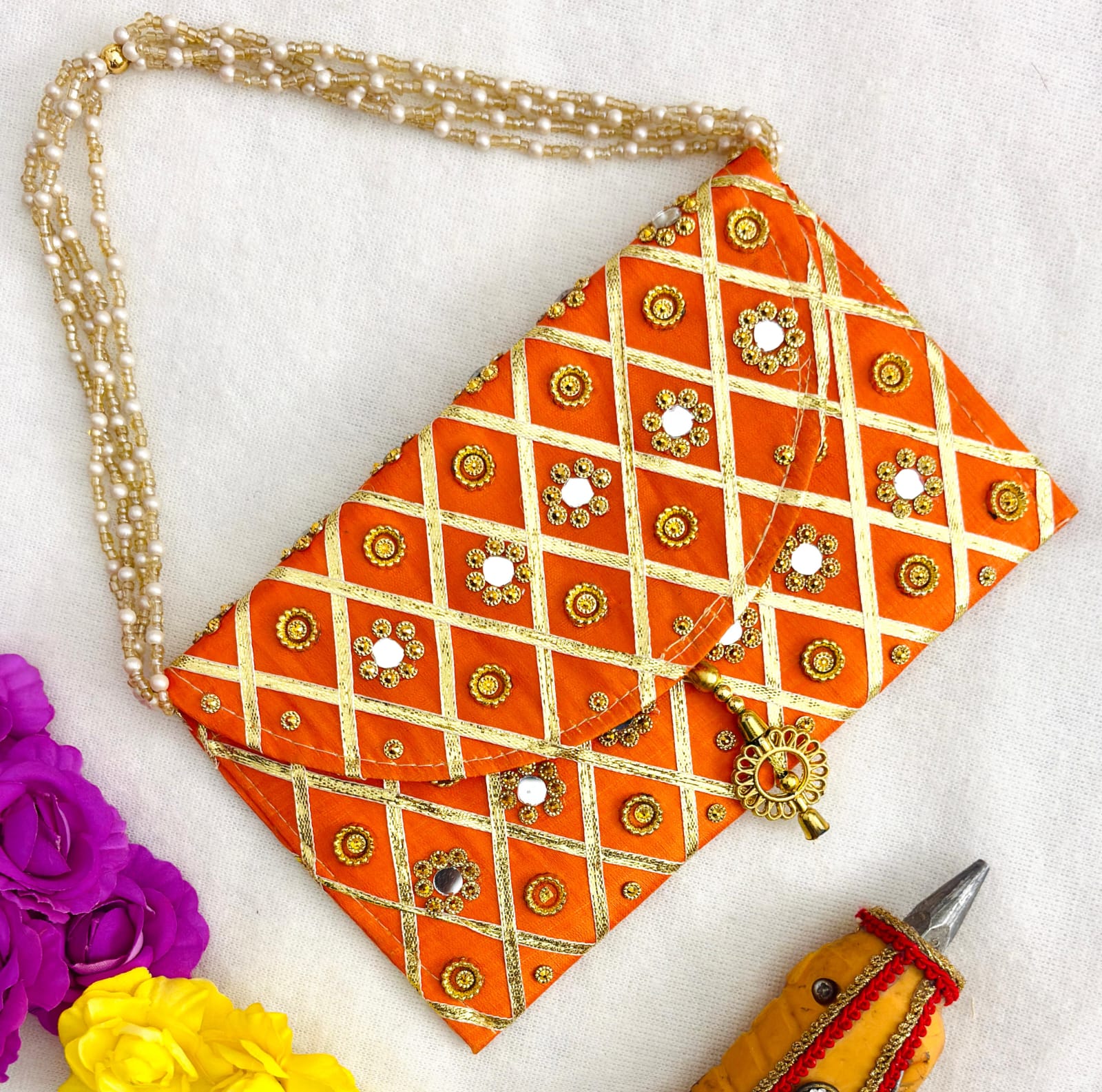 This charming and festive giveaway clutch is a true embodiment of traditional Indian artistry with a contemporary twist. The vibrant colour fabric serves as a striking canvas for an eye-catching diamond-grid pattern, intricately formed with golden lines. Each intersection and center of the diamond is adorned with a mix of shimmering mirror work and delicate golden embellishments, creating a dazzling effect that catches the light beautifully.